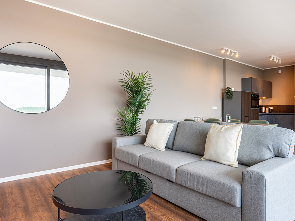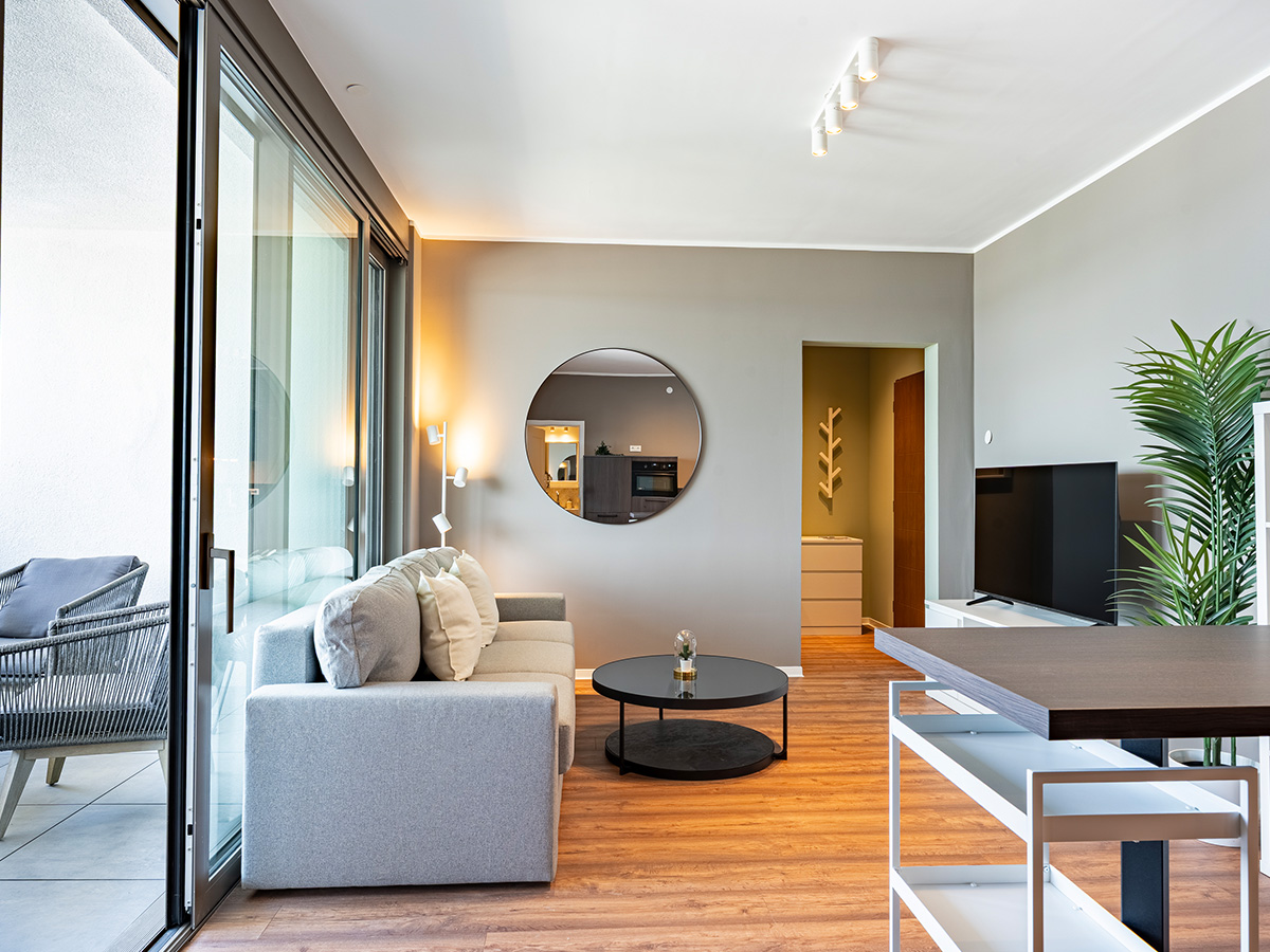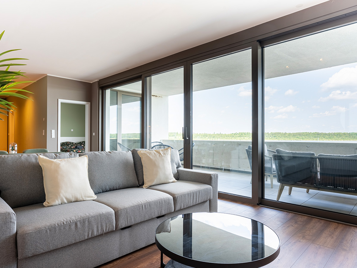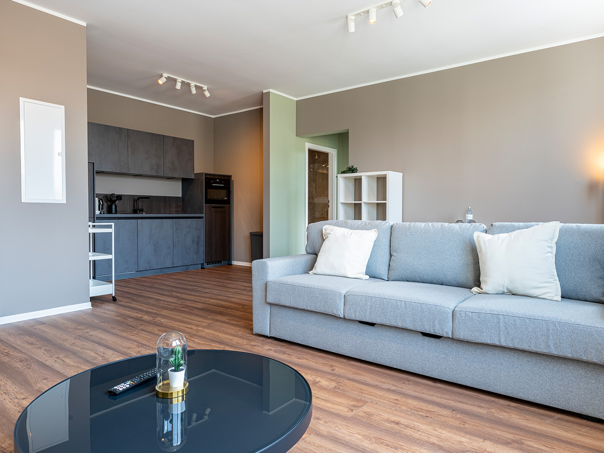 Das Bild zeigt das Wohnzimmer in einem Haus-6-Apartment, mit grauer Couch, Küchenecke und Loggia im Hintergrund.