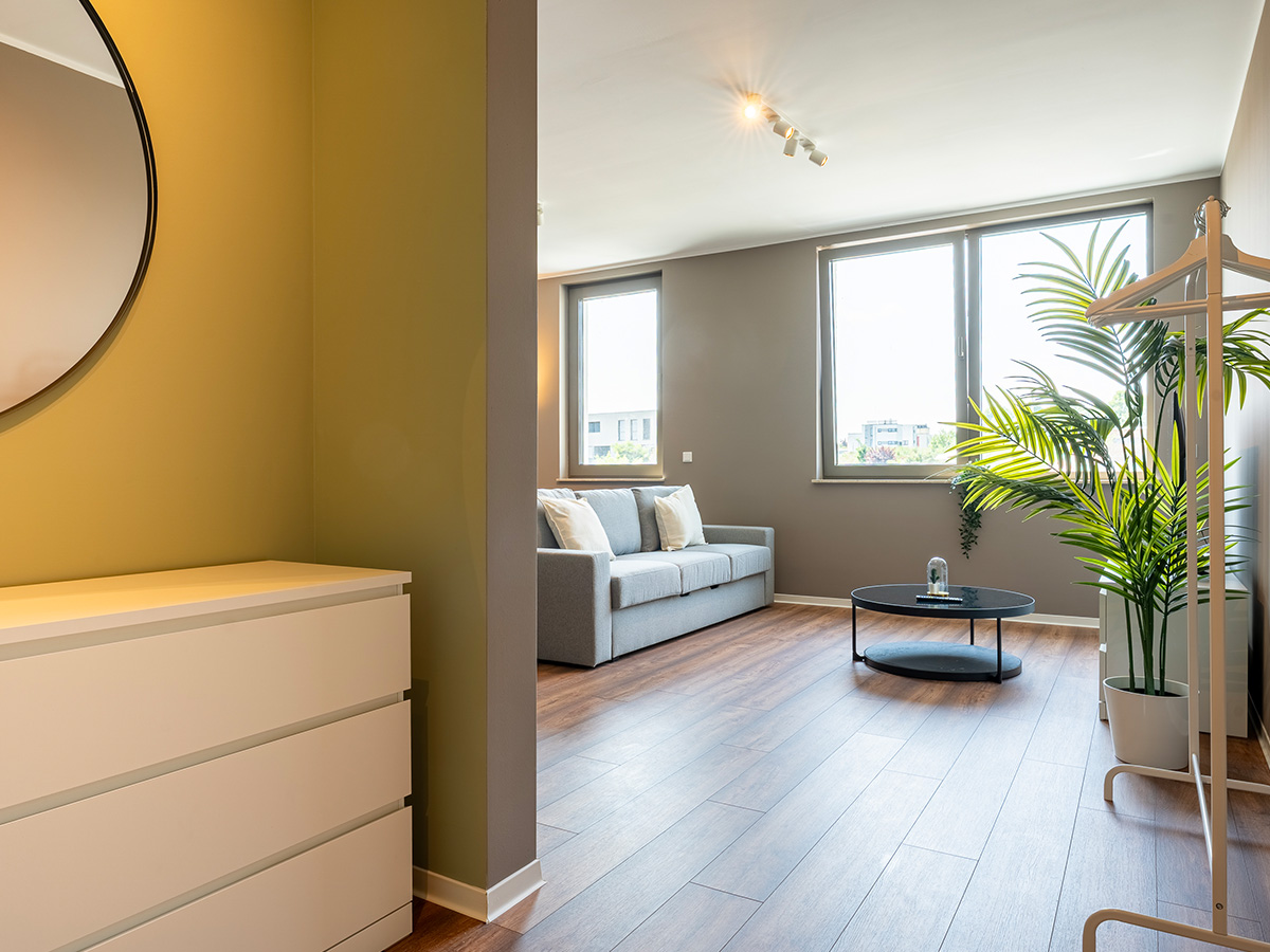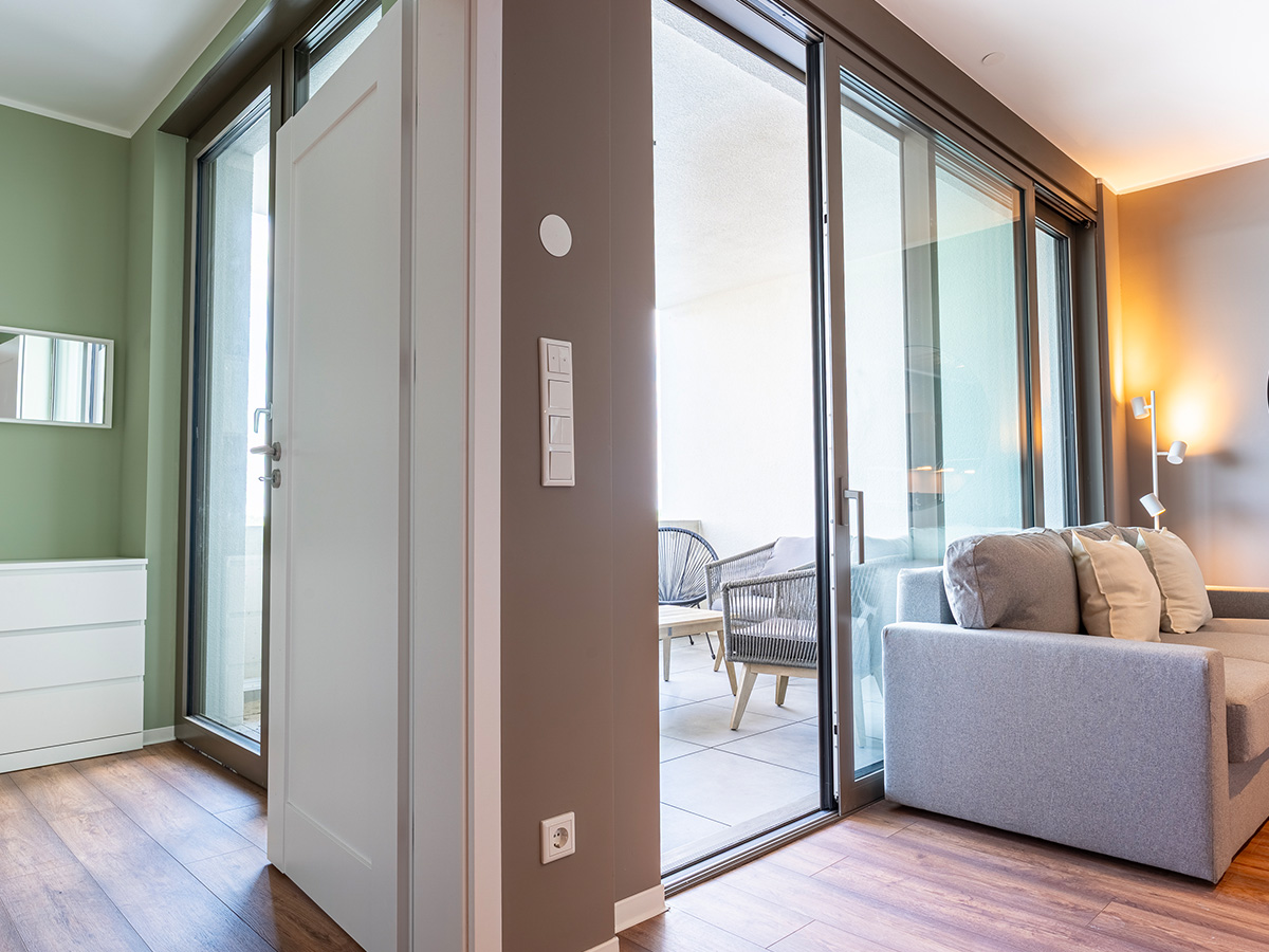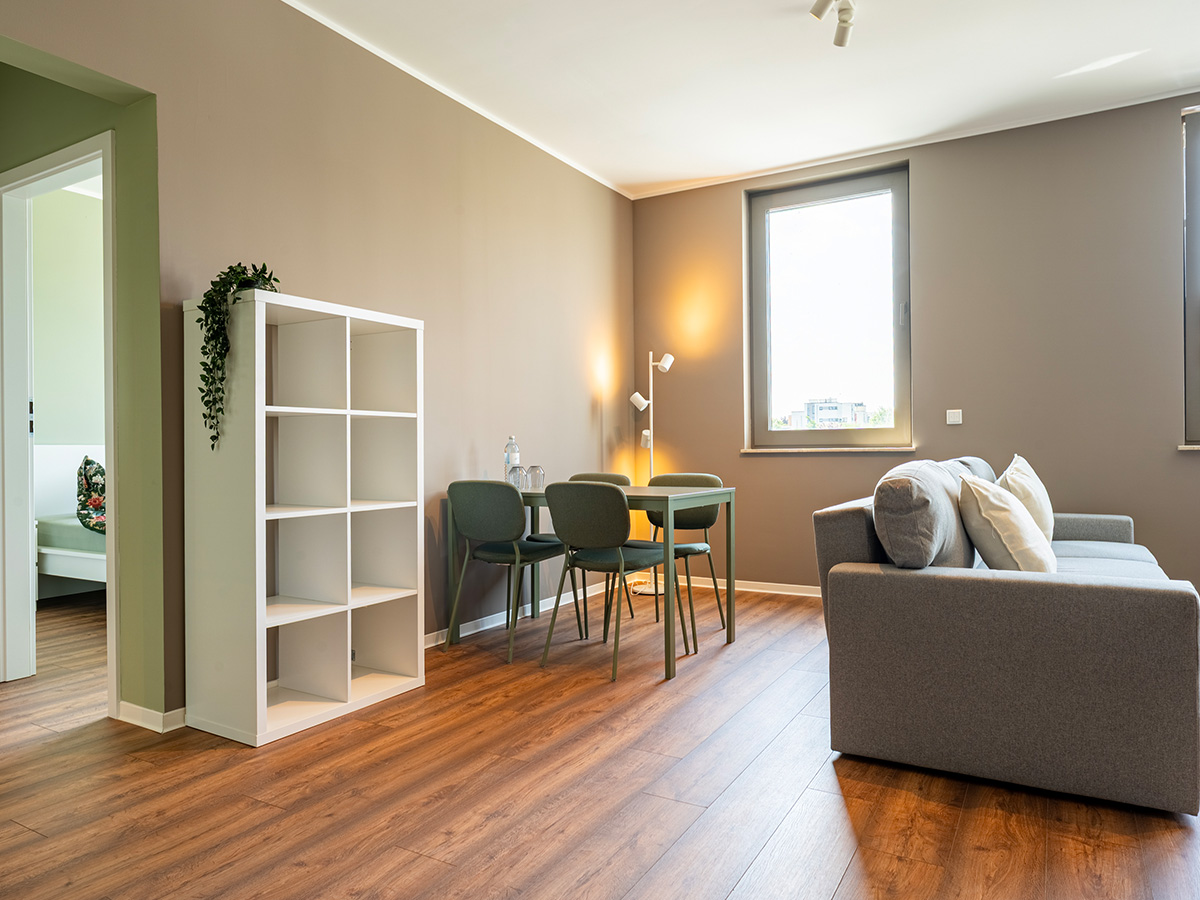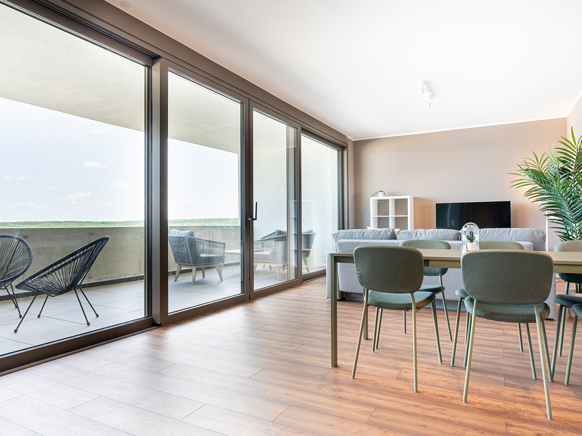 Das Bild zeigt das Wohnzimmer in einem Haus-6-Apartment, mit grauer Couch, Küchenecke und Loggia im Hintergrund.